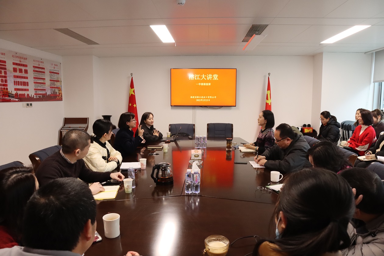 為增強公司業務員抗風險意識,2022年2月23日,公司舉辦榕江大講堂活動,邀請中國信保福州分公司專業人士開展出口信用保險知識宣講。公司黨委書記、總經理郭東亮,副總經理康文秀出席,公司職能部門負責人及業務主辦20余人參加講座。