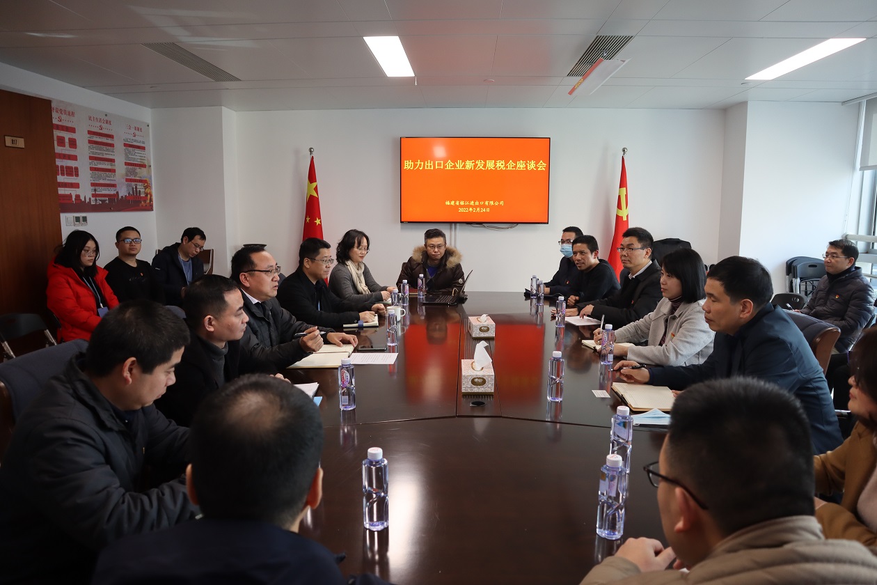 2022年2月24日,福建省稅務局第二分局副局長李葉華、福州市稅務局副局長李積場、鼓樓區稅務局副局長卓麗健率省市區三級稅務系統有關同志蒞臨公司調研并召開助力出口企業新發展稅企座談會。公司黨委書記、總經理郭東亮及其他班子成員,公司辦公室、財務部相關人員等參加座談會。