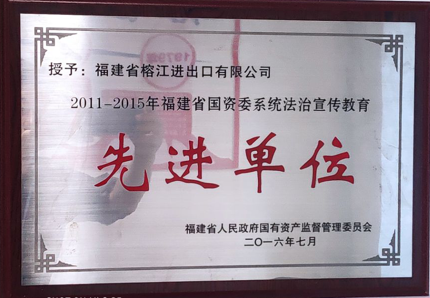 2016年7月,福建省人民政府國有資產監督管理委員會授予福建省榕江進出口有限公司2011-2015年福建省國資委系統法治宣傳教育《先進單位》榮譽稱號