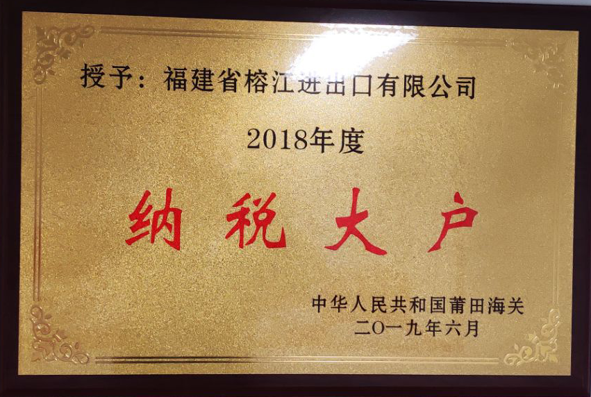 2019年6月中華人民共和國莆田海關授予福建省榕江進出口有限公司2018年度《納稅大戶》稱號